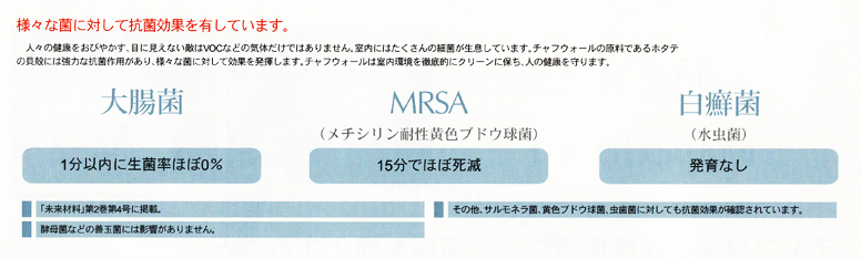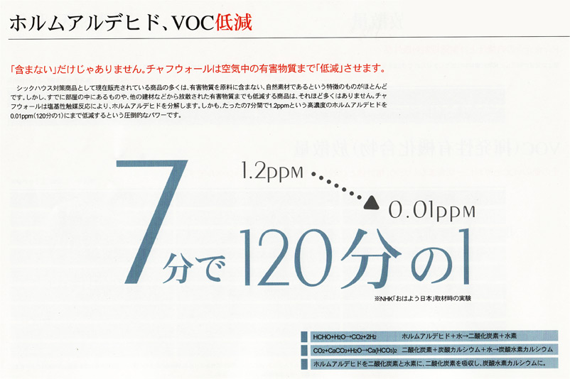 現在利用されている内装材の多くにホルムアルデヒドやVOCが含まれています。 それらが原因のシックハウス症候群には、目、鼻、のどの刺激症状、 粘膜の乾燥、皮膚の紅斑・湿疹、頭痛、めまい、吐き気等さまざまな反応症状があると いわれています。チャフウォールは以上のようなシックハウス症候群に対応しうる商品です。 ホルムアルデヒドを1/120に、VOCを1/3以下に減少させ、また既存の壁にチャフウォールを塗装すれば、 下地から放出される化学物質を封じ込め、さらに焼却してもダイオキシンの発生を低減させます。